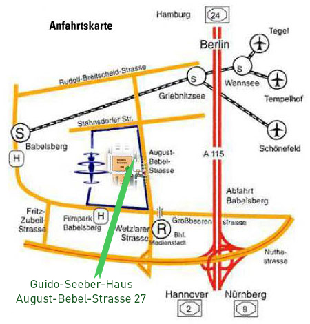 Vom Potsdamer Hauptbahnhof aus fährt Sie der Bus 694 in Richtung Konrad-Wolf-Alle/Sternstraße bis zur Haltestelle Stahnsdorfer Straße/August-Bebel-Straße. Von dort sind es noch etwa 5 Minuten Fußweg zum Haupteingang des Studio Babelsderg. Das Guido-Seeber-Haus finden Sie direkt neben dem Eingang.